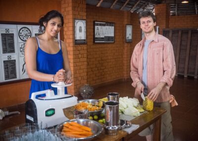 “Having a wonderful time in Kerala! Sjonum & Phil are amazing! Loving the itinerary. Yoga, temples, visiting the elephants, and the salads and foods Phil has prepared are exquisite! Coconuts at every turn – Love it ! I could not think of better people to show me several areas of India which was why I decided to come. I have no complaints. For me, you have shared your techniques of both yoga and nutrition and many more things. Your choices of hotels, shopping, local markets, and areas in Kerala are wonderful. Much Gratitude!”